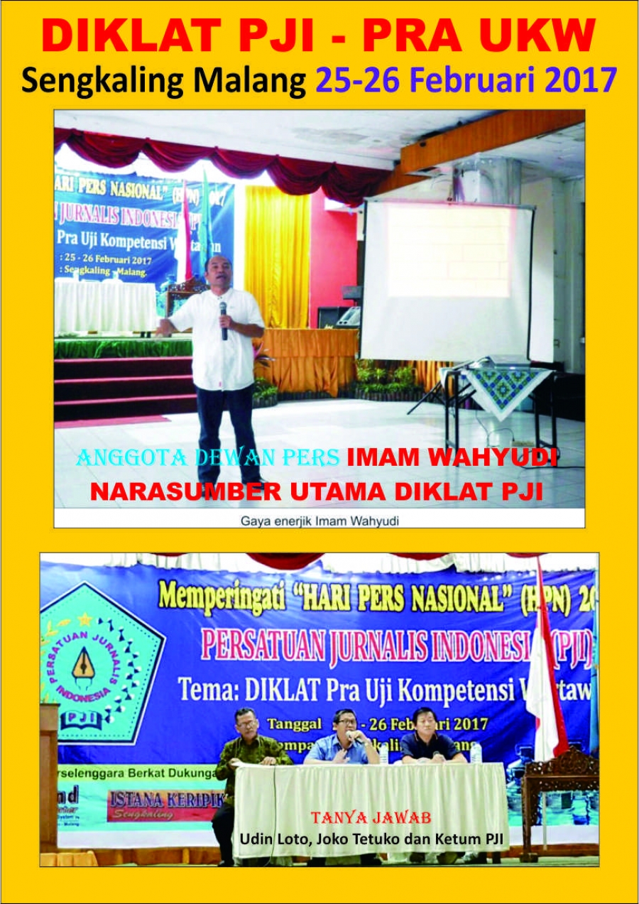 Ketukan 3 kali Hartanto Boechori Ketua Umum PJI diatas mikrofon menandai resmi dibukanya Diklat Jurnalistik PJI di Hall Wisata Sengkaling Malang Sabtu-Minggu 25-26 Februari. Diklat yang diselenggarakan DPP PJI dan diikuti sekitar 250 anggota PJI serta wartawan media cetak/elektronik dari berbagai daerah dalam rangkaian menyemarakkan Hari Pers Nasional (HPN) 2017.